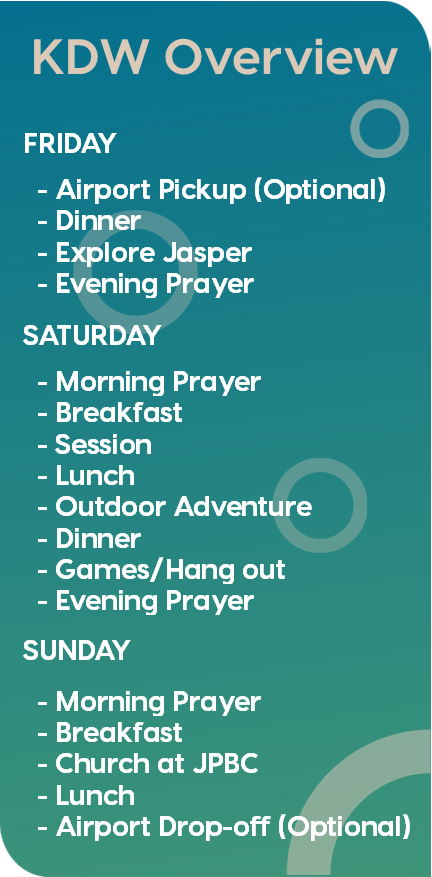 Come join us in Jasper for a discovery weekend, where you will get a small taste of the Kurios experience! We invite you to discover a different rhythm of life where our days begin and end with community prayer, where we learn from Scripture and respond with worship, and where we experience the incredible beauty of God’s creation in the heart of the Rocky Mountains!
